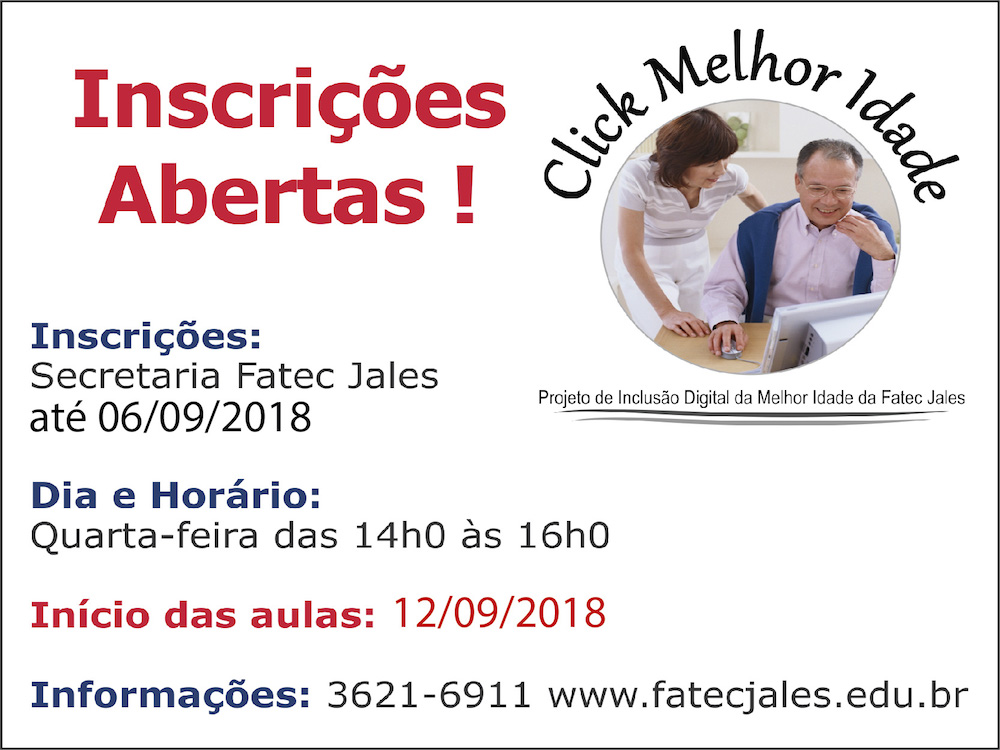 Não é em vão que pelo sétimo ano consecutivo a Faculdade de Tecnologia Professor José Camargo promove o Click Melhor Idade. Seu sucesso entre os participantes, que, com ele, vislumbraram um mundo de mais possibilidades, tem mostrado que ele deve continuar. De 3 a 6 de setembro de 2018, o projeto está novamente com suas inscrições abertas para pessoas com mais de 50 anos que desejam inserção no mundo digital. O curso, que continuará em parceria com o Fundo Social de Solidariedade de Jales, iniciará no dia 12 de setembro. As inscrições devem ser feitas na secretaria da faculdade. As vagas são limitadas!!!