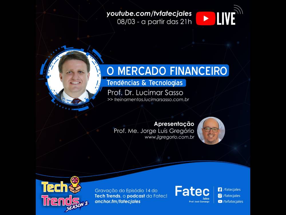 A segunda temporada do Tech Trends vem a todo vapor. No dia 8 de março, a partir das 21h, os interessados em saber mais sobre mercado financeiro por uma autoridade na área podem participar da live que será realizada pelo Prof. Dr. Lucimar Sasso, com a apresentação do Prof. Me. Jorge Luís Gregório. O canal TV Fatec Jales, no Youtube, será o palco do evento.